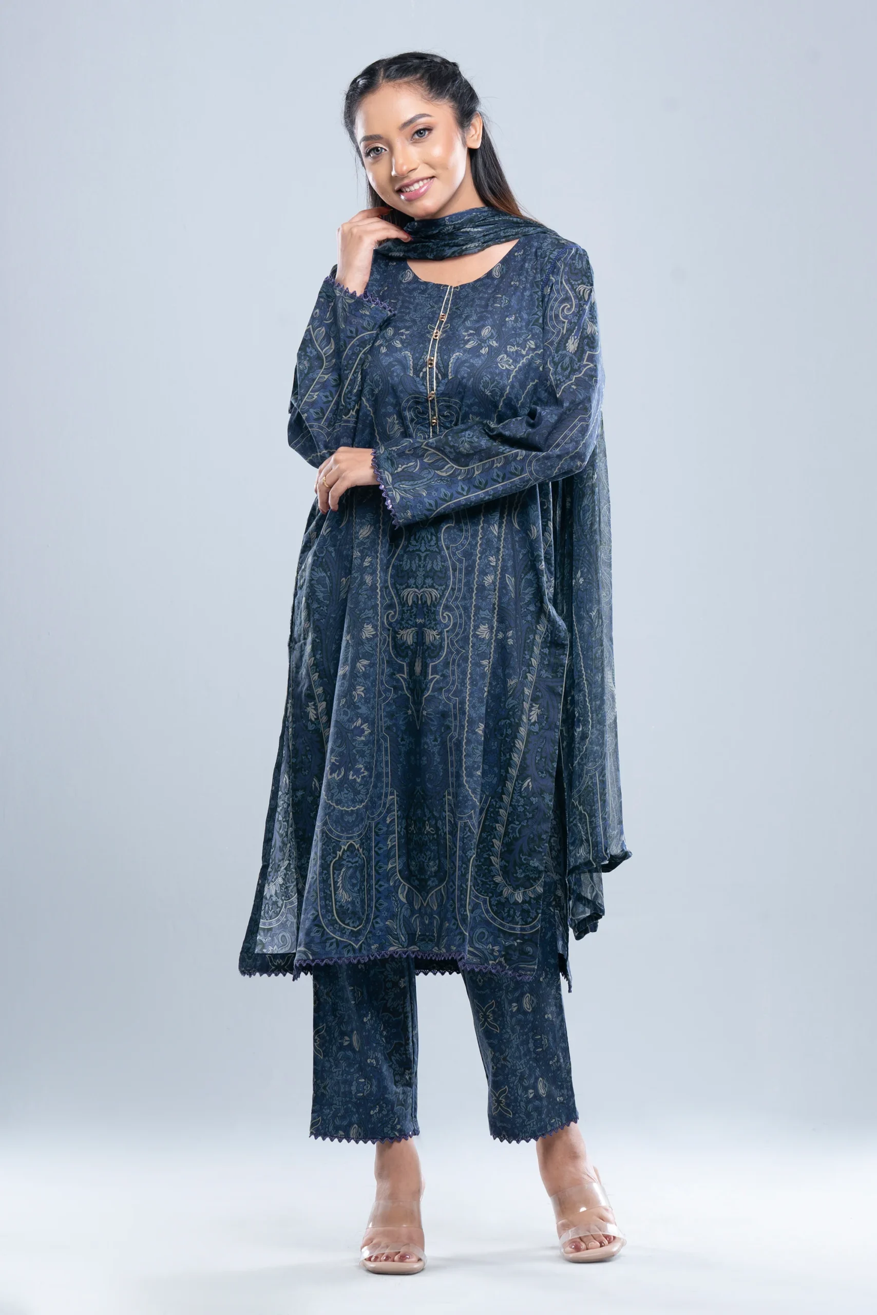 Elevate her festive wardrobe with this women’s premium burnt orange three piece set, featuring a sleeveless inner, full-sleeve long jacket, and matching pants. Crafted from woven fabric, the screen-printed jacket is beautifully embellished with detailed embroidery. Perfect for festive gatherings and elegant winter occasions.